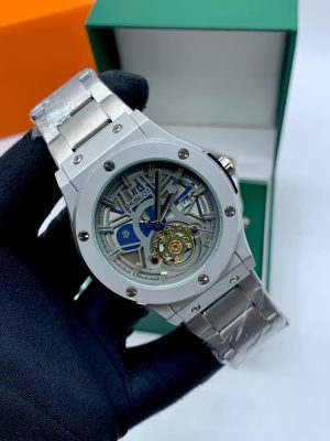 Introducing the “Best Quality Hublot Watch Set,” a collection that embodies the brand’s pioneering philosophy of “The Art of Fusion.” This robust timepiece features a distinct, bold black case and bezel, secured by the iconic exposed screws, paired with a matching, sturdy black rubber or hybrid strap. It is designed for the contemporary connoisseur who appreciates the blend of high-end mechanics and modern, industrial aesthetics.