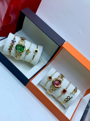 Presenting the Gucci Female Watch and Bracelet Set, a dazzling collection designed to infuse your look with instant luxury. This set is an absolute head-turner, featuring a striking gold-toned watch with a vibrant, eye-catching red dial, perfectly complemented by a trio of beautifully coordinated accessories. It’s the ultimate way to embrace high-fashion glamour.