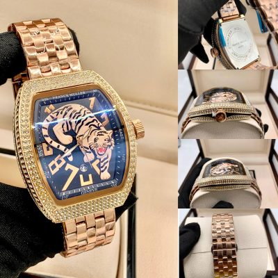 Make an unforgettable statement with this spectacular Franck Muller-style Vanguard Watch. The distinct rose gold-toned, curved tonneau case is heavily iced out with brilliant rhinestones on the bezel, catching light from every angle. The vibrant blue dial features an aggressive 3D tiger graphic and oversized numerals, combining artistry with high-impact luxury.