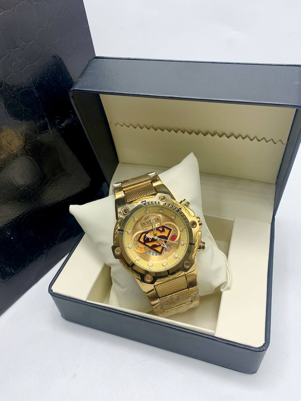 The high-polish gold bracelet features textured center links for added depth and character. Equipped with precision chronograph sub-dials and a date window, this watch is as functional as it is formidable. This is the ultimate statement piece for collectors and fans alike, blending DC Comics heritage with Invicta’s signature high-impact luxury and grand design.