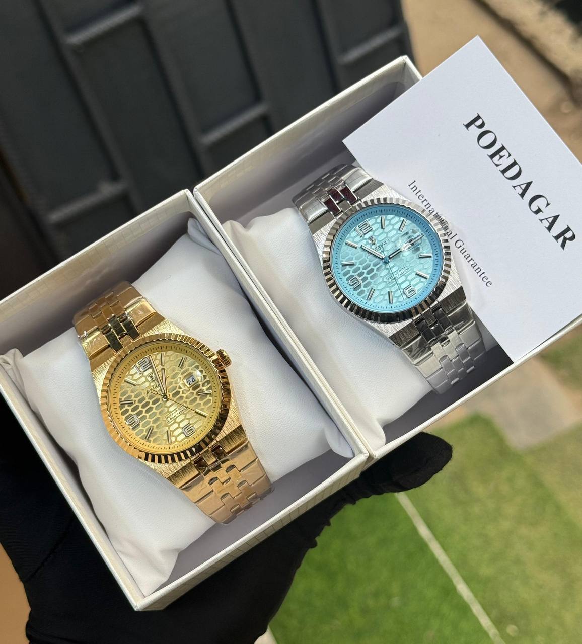 Constructed with a premium stainless steel integrated bracelet, this watch alternates between polished gold and brushed silver links for a sophisticated, high-contrast look. The secure fold-over clasp ensures a comfortable fit for all-day wear, from the boardroom to formal evening engagements. Combining regal aesthetics with reliable precision, this POEDAGAR model is the ultimate statement of success and refined taste for the modern gentleman.