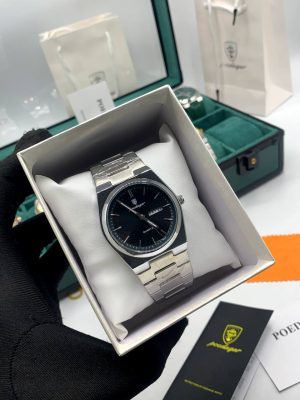 Embrace clean, contemporary style with this sleek POEDAGAR Quartz Watch. It features a distinct square-integrated case and link bracelet crafted from polished stainless steel, giving it a modern, geometric profile. The deep black dial provides a high-contrast canvas for the silver hands and indices, ensuring superb legibility.