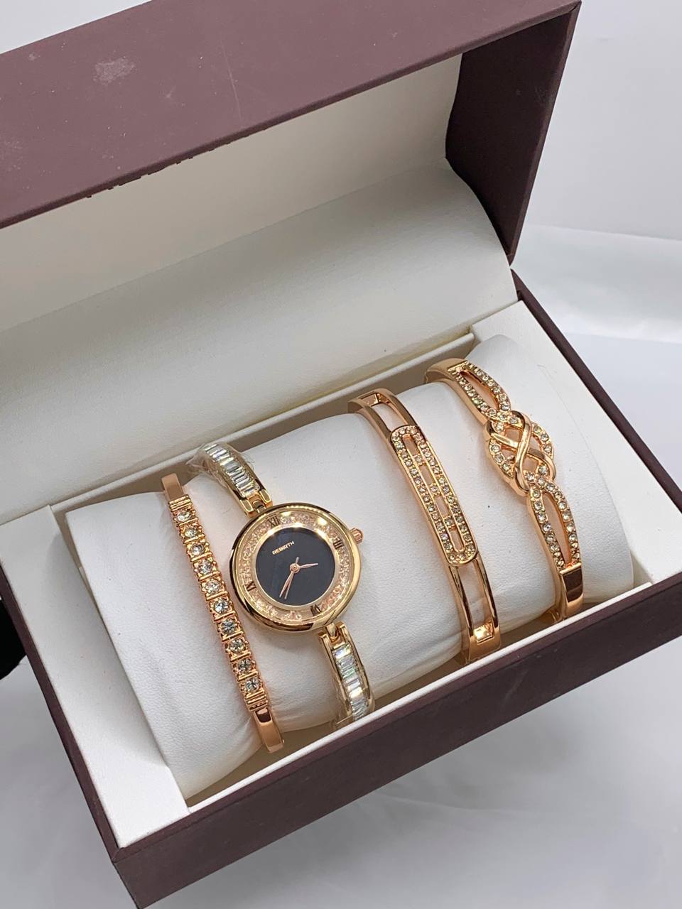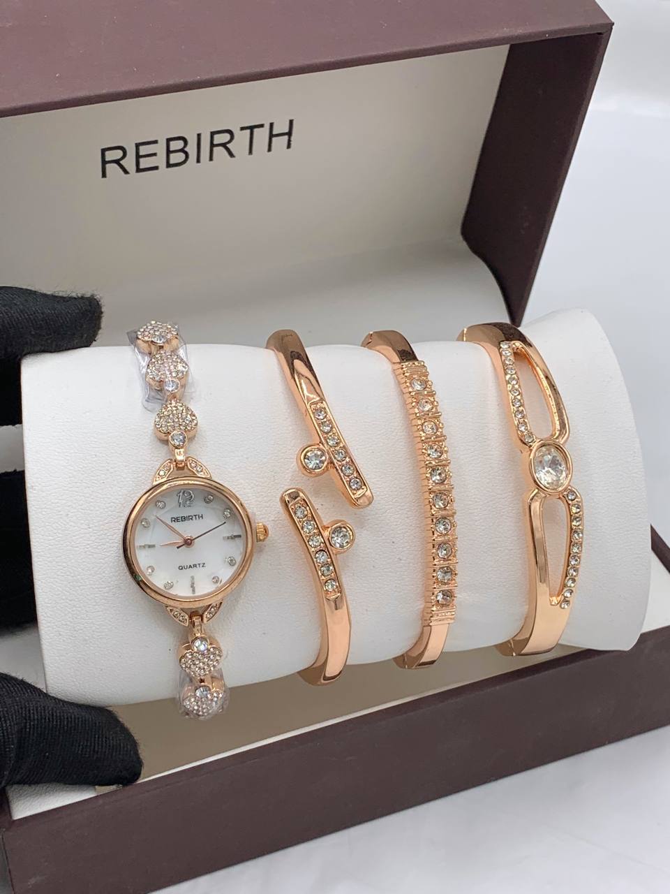 Discover the Rebirth Female Watch and Bracelet Set, a gorgeous collection designed to enhance your natural grace. Featuring a slender, barrel-shaped watch in a warm rose gold tone with a delicate crystal accent, this set radiates sophisticated charm. It’s perfectly complemented by three matching rose gold bangles, creating a layered, luminous look that is utterly captivating.