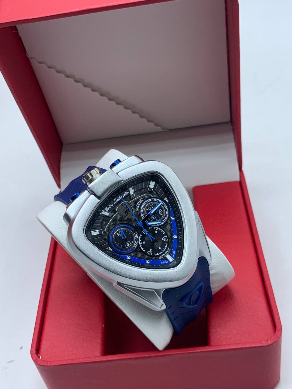 Paired with a bold, integrated blue rubber strap featuring a distinct V-pattern tread, this timepiece offers maximum durability and aggressive style. Engineered for those who demand performance, it combines Italian luxury with an aerodynamic aesthetic that makes a definitive statement on the wrist.